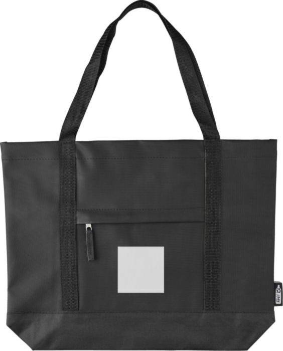 Die Tragetasche ist aus rPET-Polyester (600D) Polyester mit beidseitiger PU-Beschichtung zur Wasserabweisung gefertigt. Sie verfügt über ein Reißverschlussfach auf der Vorderseite, eine kleine Reißverschlusstasche im Inneren und lange Tragegriffe. Sie hat ein Fassungsvermögen von 10 Litern und eine Tragfähigkeit von 10 kg. Sie enthält ein rPET-Etikett und ein individuelles Etikett an der Seite.